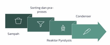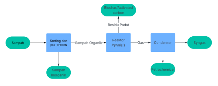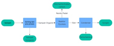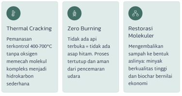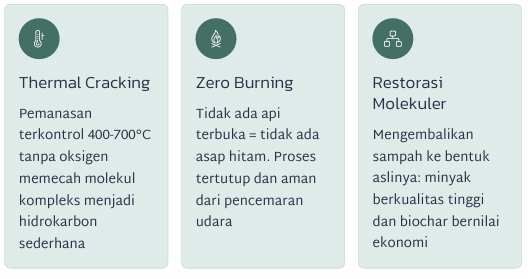 • Proses Termal: Pemecahan material menggunakan panas (400-700°C) tanpa oksigen, mengurangi emisi berbahaya.